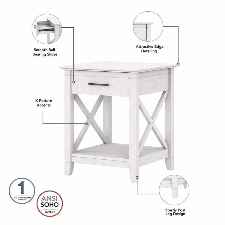 The side tables also include a drawer for small accessories like TV remotes, writing utensils and notepads while the surface easily supports a lamp, plant or pictures.